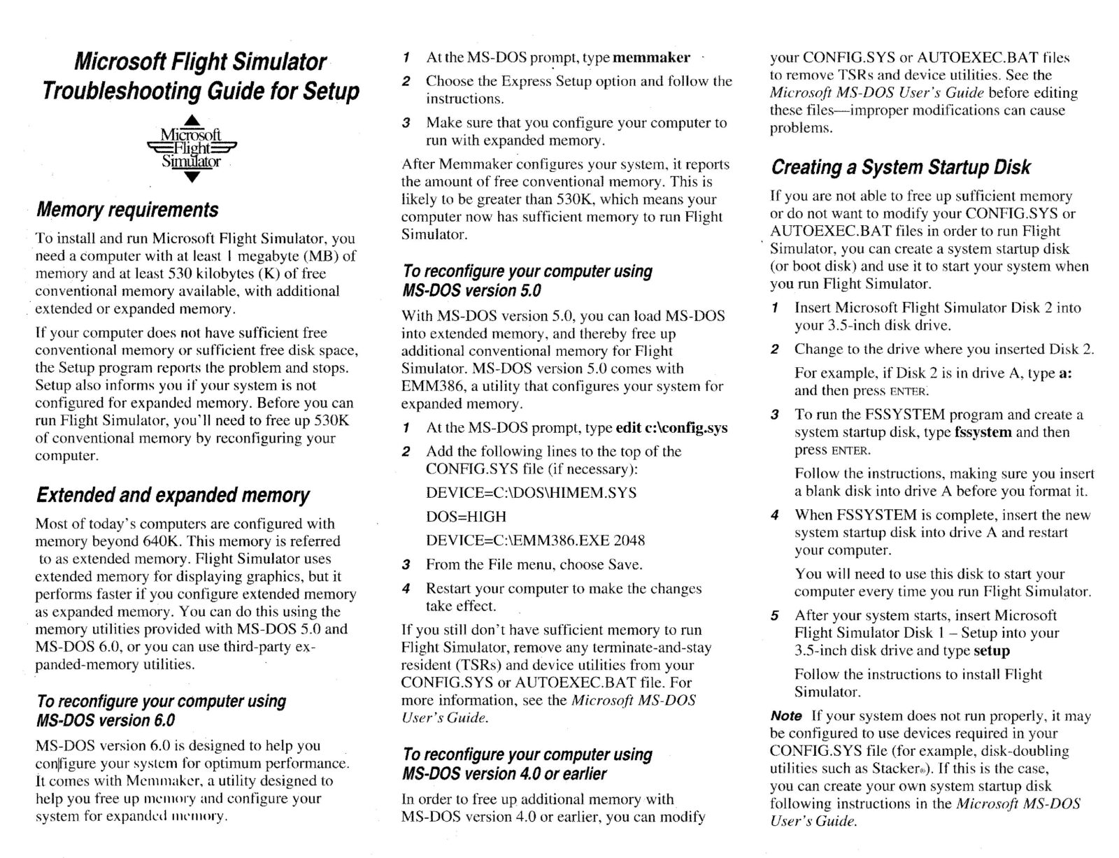 MS-DOS 5.0以上で動作すると書いてある。このソフトのバージョン番号が明記されておらず、OSのリリース時期から見るとMS-DOS 5.0は1991年だそうだ。MS-DOS 5.0で動作するMicrosoft Flight Simulatorは、WebによるとMicrosoft Flight Simulator 5.0となっており、1993年にリリースされたということになる。仮に発売と同時に買ったとすると、なんと33年前のことか